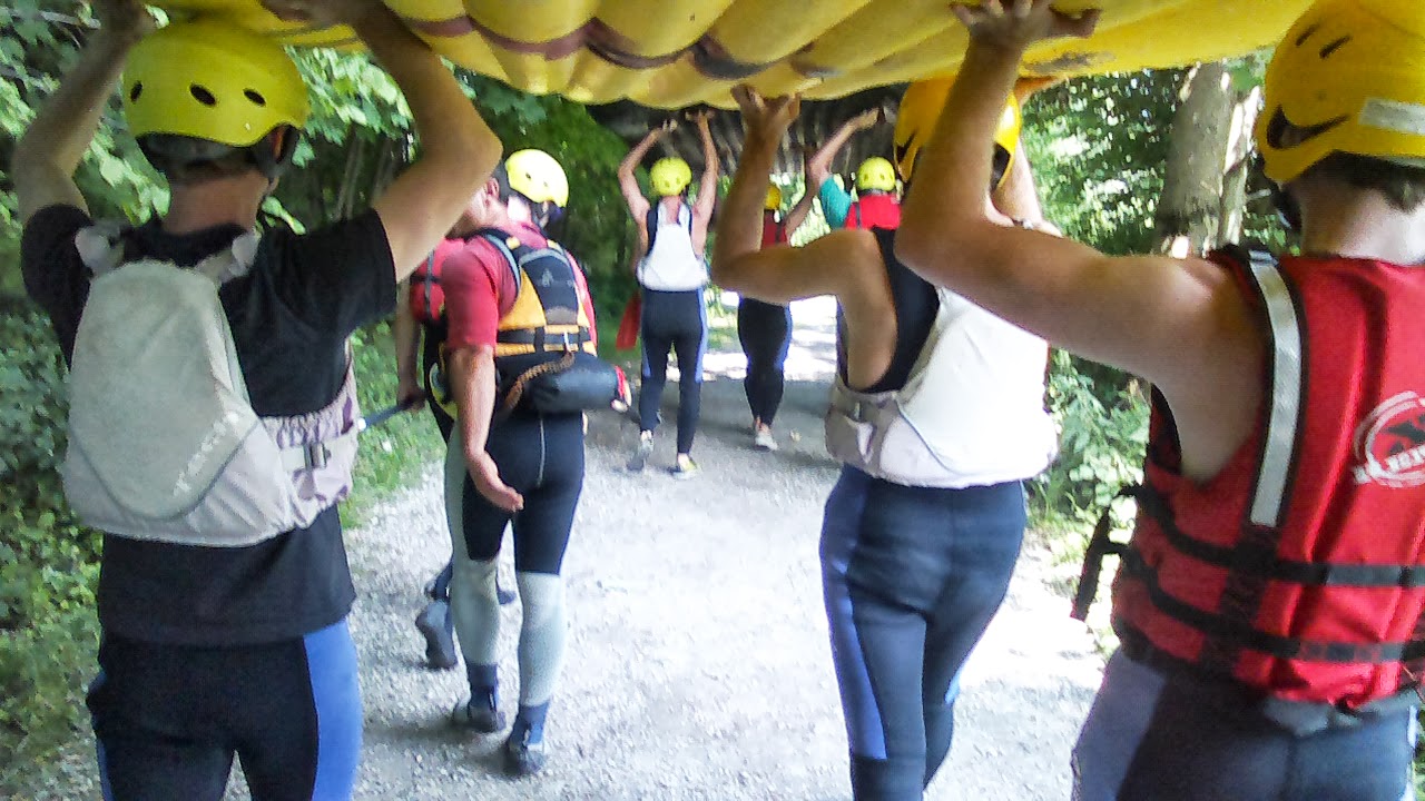 不知道是幸運還是不幸運,這些巨大的德國人把橡皮艇往上高舉過頭之後,想要出一份力幫忙搬運的我使勁的往上伸直雙手,卻根本連橡皮頂的底部都碰不到。我在橡皮艇下面舉高雙手跳呀跳的說著 "並不是我不想幫忙唷" 這一幕,似乎是泛舟教練第一次看到的畫面,他在後面笑到都要岔氣了,還一度把我抱起來舉的高高的,說:『 這樣你就摸的到皮艇了。』
